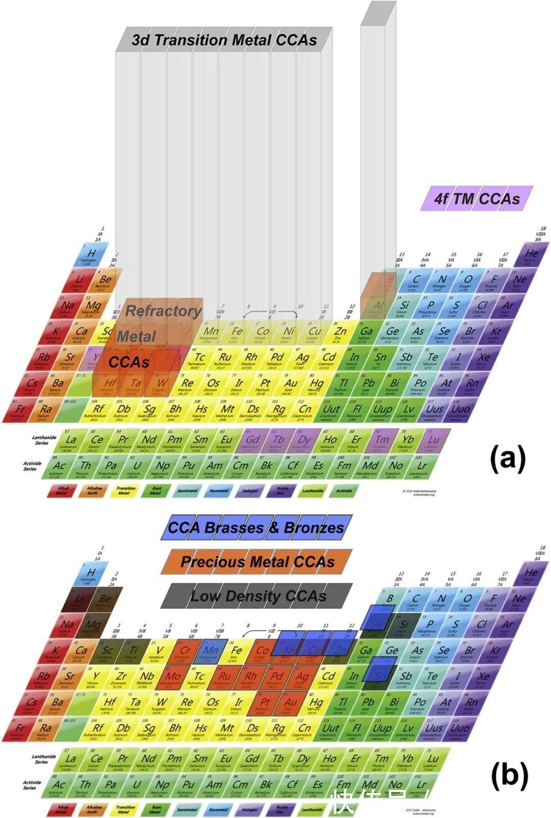 本文中统计的408种MPEAs可分为7个合金系列,如图8所示。包括3d过渡金属CCA,难熔金属CCA,轻金属CCA,镧系元素(4f)过渡金属CCA,CCA黄铜和青铜,贵金属CCA和间隙化合物(硼化物,碳化物和氮化物)CCA。